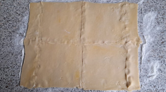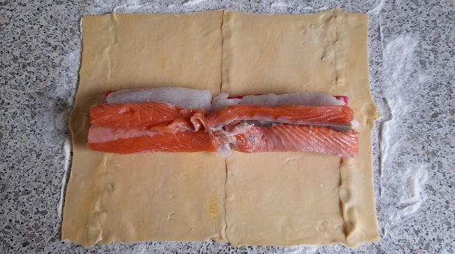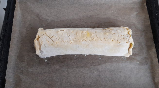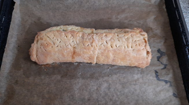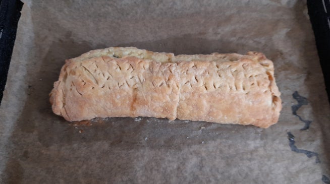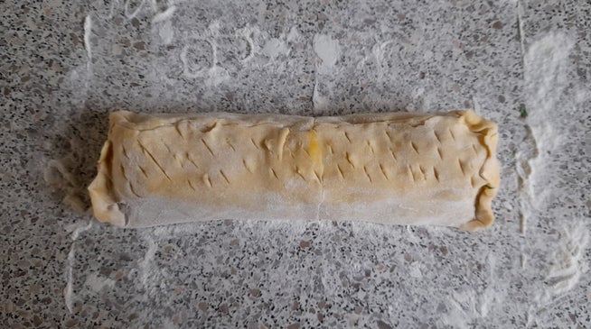 Leg het bladerdeeg, vul het met de gesneden restjes en rol het op, draai de rol om, leg op ovenpapier en prik de bovenkant in, bak in een voorverwarmde oven van 190c voor 1 uur.