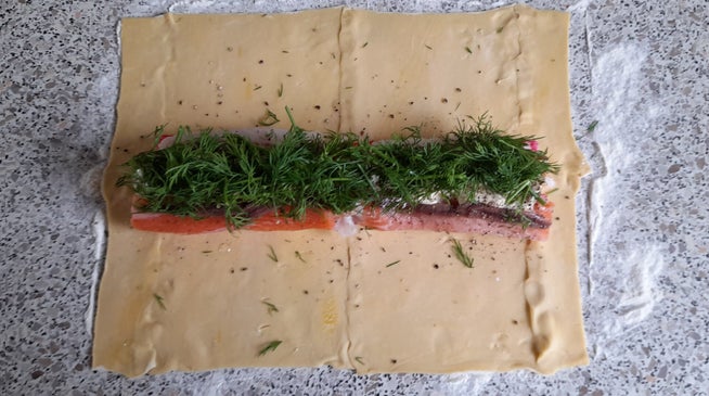 Plak het deeg aan elkaar om een smetteloos vel te maken en plaats de ingrediënten in de volgende volgorde: eerst de kaas - dan krabsticks - gevolgd door zalm en zeewolf - mayonaise en ansjovis - dille - en weer kaas.